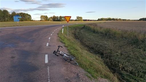 Samma sträcka som föreg. dag, dvs. på cykelbanor via Rönnby C. till Skultuna k:a, sen vidare på Skerike-vägen upp förbi Hägervallen och Lagår’n, slutligen till vsk. Skultuna-Svanå-Ramnäs, där jag gjorde ett kort stopp för ett foto. Tillbaka hem samma väg.