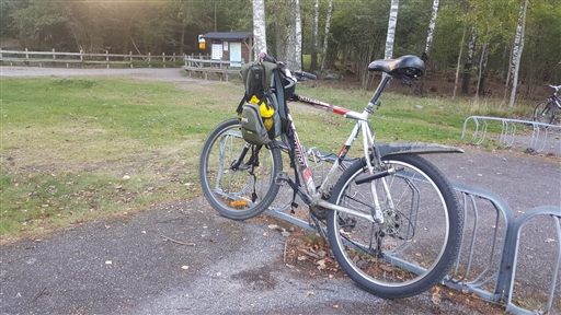 Cykel: Jag hade bytt till ett bredare bakdäck, samma typ som fram, dvs. ett Hutchinson som blev ca 51-52 mm brett (uppmätt). Det kändes snabbt och lätt, men det blev vobbligt i tvära asfaltskurvor, kanske beroende på för brett däck till 19 mm-fälgen i kombination med relativt lågt däcktryck (ca. 25 PSI för cat. 3 gravel). Det kändes som om däcket skulle kunna krängas av fälgen då jag lutade ned cykeln kraftigt.