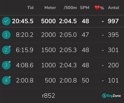 2000m-1500m-1000m-500 m, 3 min vila mellan. Nedvarvning.