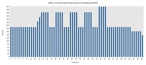 Jag körde ett inomhuspass på den stationära motionscykeln. 65 min totaltid, varav 5x4 min tröskelintervaller. Effektkurva på bilden nedan enligt cykeldatorn som jag följde.