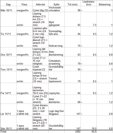 Lör 15/11;1 pass (valfritt tid);Cykel distans (Z2, 2 h 20 min) + kort stretch;Lugn dag före långpass;147;–;0,8