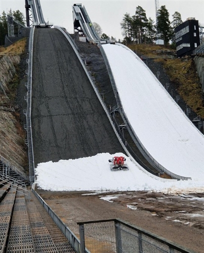 Ca 400hm. Men jag var lite Umarell också (Vinterversionen) och betraktade snöutläggningen i hoppbackarna. Snart tävling i både lilla och stora backen.