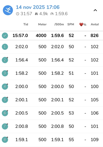 8x500 m, 2 min vila mellan. U-/n-varvning.