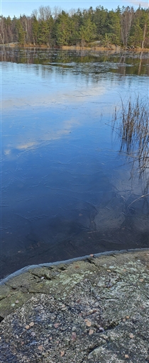 Nu är Dammtorpsjön omvänt skiktad och därmed är det bara ytan som behöver kylas mer. Ca 2 mm tjock Is, 25 ut från Golfhällen. Inga näckrosblad utanför hällen.