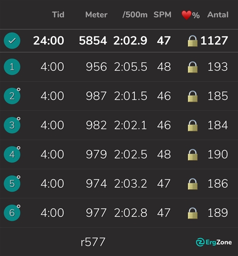 Intervaller. 6x4 min, 2 min vila mellan. U-/n-varvning.
