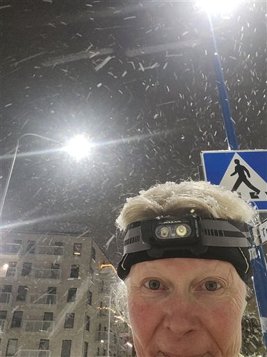 Hjälp, mera snö föll.. 👀❄️ ut i -0,7 grader o en jobbig vind. Vanliga rundan o snön tilltog. Riktigt envis vind vägen mot Ängby, snön stack i ögonen. Skönt att komma hem, men fick sopa undan snön innan jag kom in i värmen.