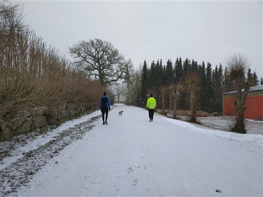 Lördag och precis som vanligt med Mentor, Hund och Brevlådekompis med ifrån start i några minusgrader, mulet och lite kall blåst. Blev Torsgårdsvägen som var aningens för halkig på sina ställen och därefter skogsvägen som också bjöd på lite lurigt underlag. Ett par km själv först med lite musik och hade tänkt max 15 km men väl på väg hemåt ifrån Skogskullespåret blev det en liten omväg för att få ihop dagens runda,