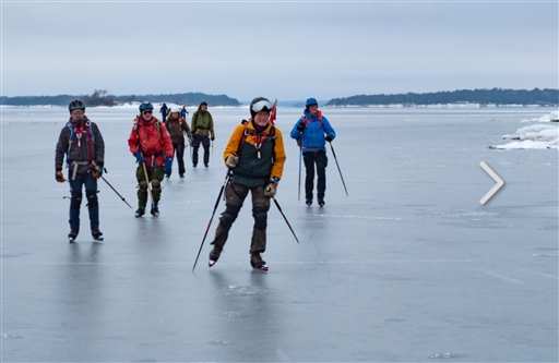 14 deltagare. Carl och Kristina i kön. Svag medvind, mulet, -3 grader . Trevlig stark grupp. Flera hade stugor som vi åkte och kollade på. Även ut till Trulsör (Året på ön med viggen Viggo.)
