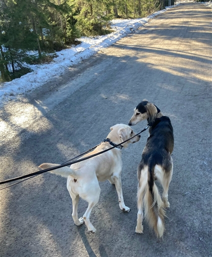 Inte helt okej än, så det blev en hundpromenad igen i det fina vädret. Fick sällskap av en hundkompis också.