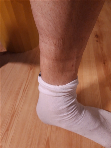 Bild: Då jag kom hem noterade jag att strumporna hade gjort märken kring vaden i höjd med skadan. Jag har aldrig tänkt på det tidigare, men jag funderar på om det kan ha någon inverkan, typ att det stoppar upp blodflödet på något sätt. För det här passet råkade jag ha på mig ett par gamla engångsstrumpor från sjukvården, som jag inte brukar gå i normalt sett, över dessa de lite tjockare "arbets"-sockorna. Man borde nog ha strumpor där inte vaden liknar en kassler efter att man använt strumporna.