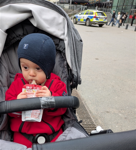 Checkade snabbt in på hotellet och sedan ut med två lätt överraskade bebisar eftersom deras föräldrar behövde bebisfritt för att fixa inför ettårsparty. De somnade efter ett tag. Runt Råstasjön, och sedan en fruktansvärt pulshöjande episod inne i Mall of Scandinavia. Sjukt mycket folk. Per köpte take away till oss. Jag köpte klämmisar till bebisar. Leon vaknade. Skeptisk. Han fick en klämmis medan vi åt, men fortfarande mycket skeptisk till arrangemanget. Syrran sov.😄