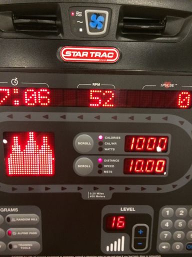 Hem från jobbet, mat, iväg till gymet, högg en ledig X-trainer och körde igång. Tung i benen till en början. Ett "alpinpass" med tre toppar. I topparna sprutade svetten och det kändes att det tog idag. Skönt. Avslutade gymbesöket med lite push-ups, plankor, ryggövningar och stretch. En rolig detalj var att X-trainern indikerade exakt 1000 kalorier då trippmätaren slog över till 10.00 km. Alltid kul med eleganta siffror.