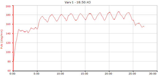 Känns bättre än väntat så istället för bara lugn fart kör jag 10x1 min ordentligt (fart 20+) med 1 minuts vila (fart 15).