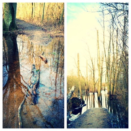 Roligt inslag på rundan: Byggde mig en provisorisk spång över en rejäl översvämningspöl för att hundra meter senare mötas av ytterligare en som var än mer rejäl. Tänk mindre sjö. Fick snällt vända om och passera den vobbliga spången en gång till. Mötte en medlöpare som gick samma öde till mötes och sällskapssprang med henne ett par kilometer och tjötade lite om ditten och datten (på Gbgska) - bland annat om löpning, klättring och... dans - innan jag vek av mot Nosaby/Hammar och de sista 12.